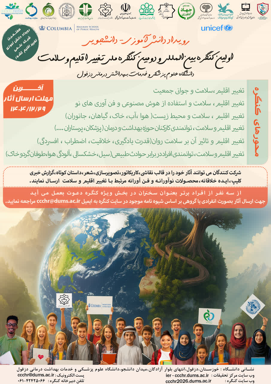 دانشآموزان و دانشجویان عزیز: ارسال آثار به همراه تکمیل فرم ثبت ایده مربوط به دانش آموزی یا دانشجویی از طریق آدرس ایمیلccchr@dums.ac.ir مرکز تحقیقات تغییر اقلیم و سلامت دانشگاه علوم پزشکی دزفول خواهد بود.